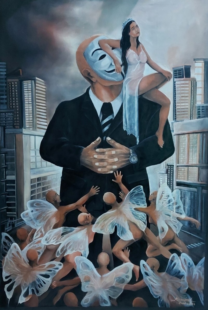 Lukisan ini tercipta sebagai gambaran realita kehidupan berkaitan dengan perkembangan aura negatif atas keberhasilan yang diraih selama di dunia, harta dan jabatan menjadi pemicu dalam perubahan karakter manusia karena manusia tidak luput dengan hawa nafsuLukisan obyek figure seorang laki-laki yang serba berkecukupan terlukiskan akan selalu dihadapi godaan bidadari-bidadari malam akan masuk saat-saat kepenatan dan kegalauan terjadi, dibalik topeng tersembunyikan cerita dibalik layar, namun kodrat alam tercipta bahwa ratu kerajaanlah yang menjadi penguasa segalanya.