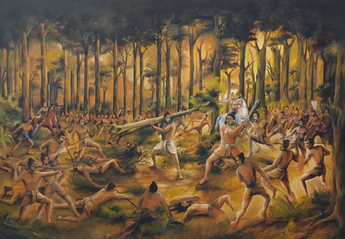 Lukisan Perang Bubat ini dibuat dari pengalaman empiris dari salah seorang tokoh sesepuh sunda yang juga seorang paranormal, dimana situasi kondisi yg terjadi mengikuti apa yang didengar dan apa yang disampaikannya. Tampak terlukiskan suasana perang dimana tokoh dari kerajaan Sunda yaitu Raja Lingga Buana saat perjalanan untuk menerima lamaran pernikahan putrinya yaitu Dyah Pitaloka ke Raja kerajaan Majapahit yang mana di masa itu mempelai wanitalah yang datang ke mempelai pria. Dengan menggunakan sebongkah pohon besar Raja Lingga Buana melakukan perlawanan atas keperkasaannya melawan pasukan dari kerajaan majapahit, terlukiskan disana tokoh patih Gajah Mada dalam pasukan Majapahit tersebut. Kondisi perlengkapan perang kerajaan sunda sangatlah terbatas dibandingkan dengan perlengkapan pasukan Majapahit karena tujuannya bukanlah untuk berperang namun tujuannya adalah untuk menerima lamaran dari kerajaan Majapahit yaitu Raja Hayam Wuruk. Perang Bubat terjadi pada tahun 1357, Peristiwa perang berlangsung di Bubat, sebuah wilayah di Jawa Barat.