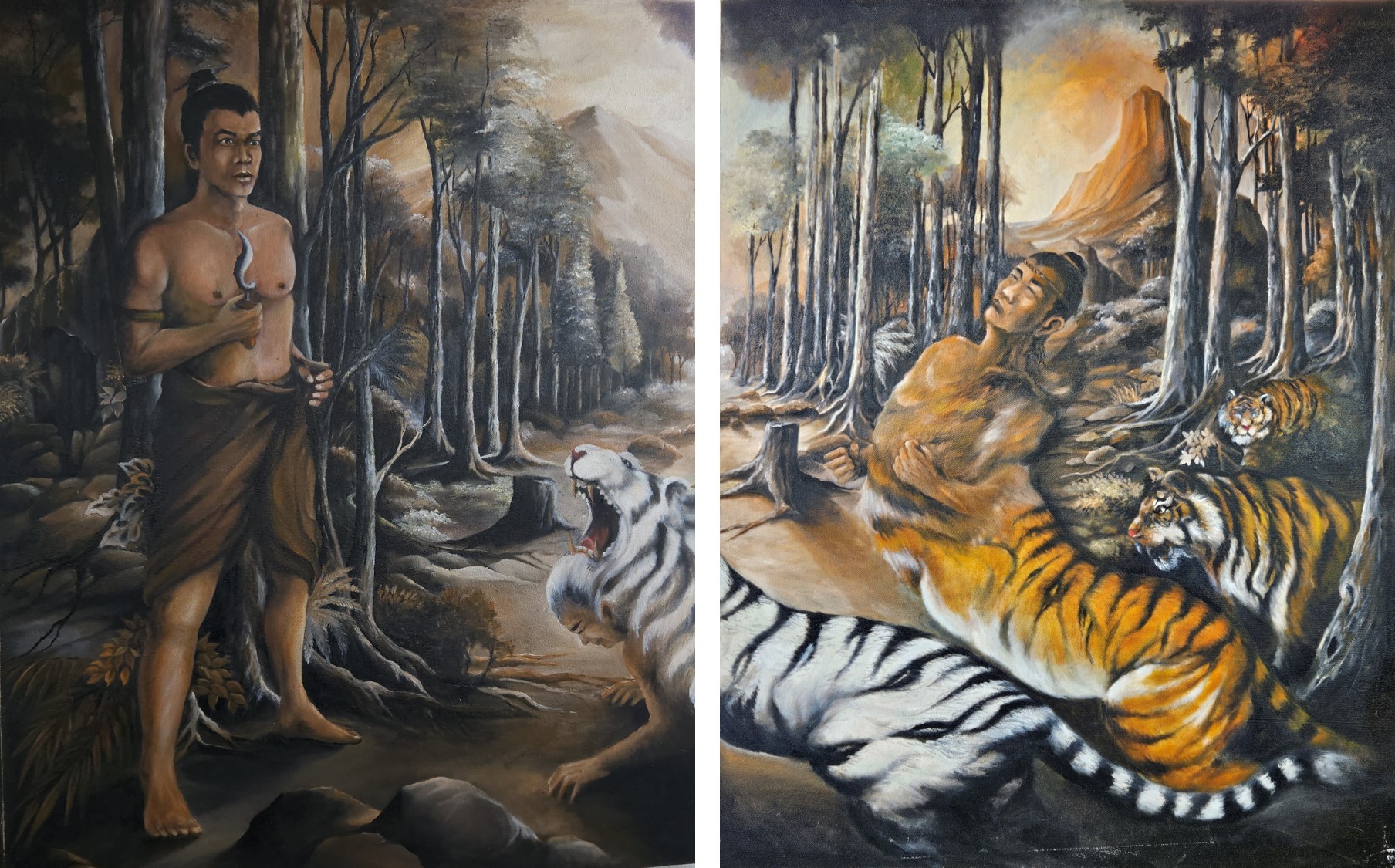 Karya Lukisan sejarah ini dibuat menggunakan 2 media kanvas yang satu sama lain saling berhungan. Obyek utama dalam lukisan ini adalah Prabu Siliwangi, raja terbesar di Kerajaan Sunda Jawa Barat dan pasukan Harimau yang melakukan Inkarnasi (Moksa). Pasukan Harimau dalam lukisan merupakan pasukan pengawal daripada Prabu Siliwangi yang biasa. Adapun adalah seekor harimau yang dianggap sebagai lambang kekuatan dan keberanian Prabu Siliwangi dan memiliki karakter sangat kuat dan berani, yang bisa ber inkranasi menjadi manusia, menjadi kekuatan dalam pasukan perang. Adapun Harimau Putih merupakan pelindung dan penjaga Prabu Siliwangi selama perang melawan Kerajaan Majapahit. Menurut legenda, harimau putih ini memiliki kekuatan yang luar biasa dan dapat berubah wujud (Inkarnasi) menjadi seorang pengawal yang gagah berani mengalahkan musuh-musuh Prabu Siliwangi. Harimau putih dalam sejarah Prabu Siliwangi memiliki simbol kekuatan dan keberanian, Pelindung dan penjaga, Lambang kehormatan dan kebanggaan.