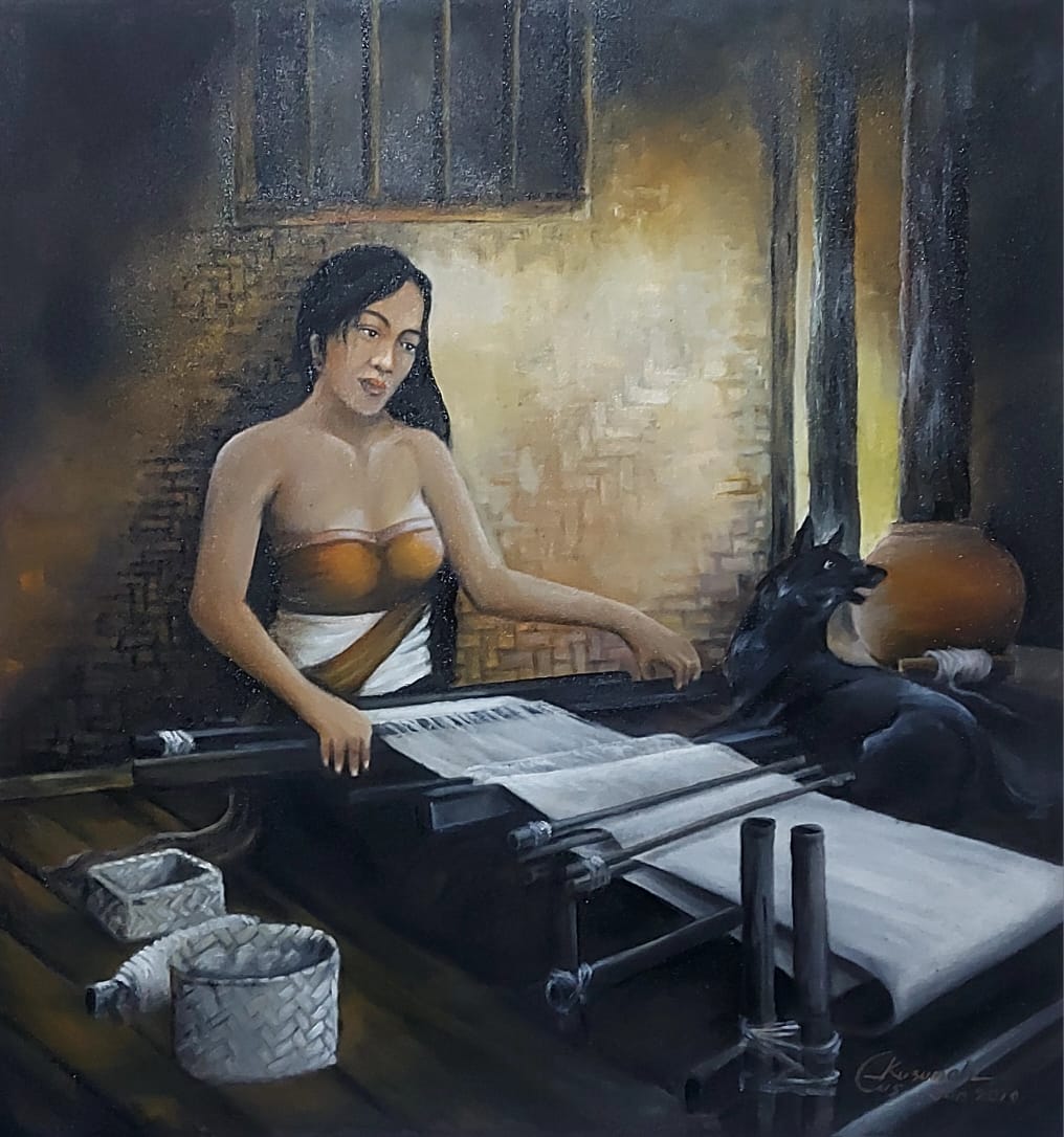 Karya ini dibuat berkaitan dengan simbol budaya dan tradisi yang diangkat dari salah satu tokoh dalam cerita mitologi Sunda Jawa Barat, yaitu "Dayang Sumbi" yang sedang menenun (tenun sunda) dengan menggunakan bahan alami benang sutra dikerjakan secara manual dan teknik pembuatan yang unik dengan cara menganyam atau mengikat benang secara horizontal dan vertikal menggunakan alat tenun. Sementara anjing hitam ( Si Tumang) adalah tokoh yang mendampingi Dayang Sumbi yang merupakan penjelmaan dari seorang pria yang tidak lain adalah suami dari Dayang Sumbi itu sendiri yang dikutuk menjadi seekor anjing dalam cerita mitologi sunda ini