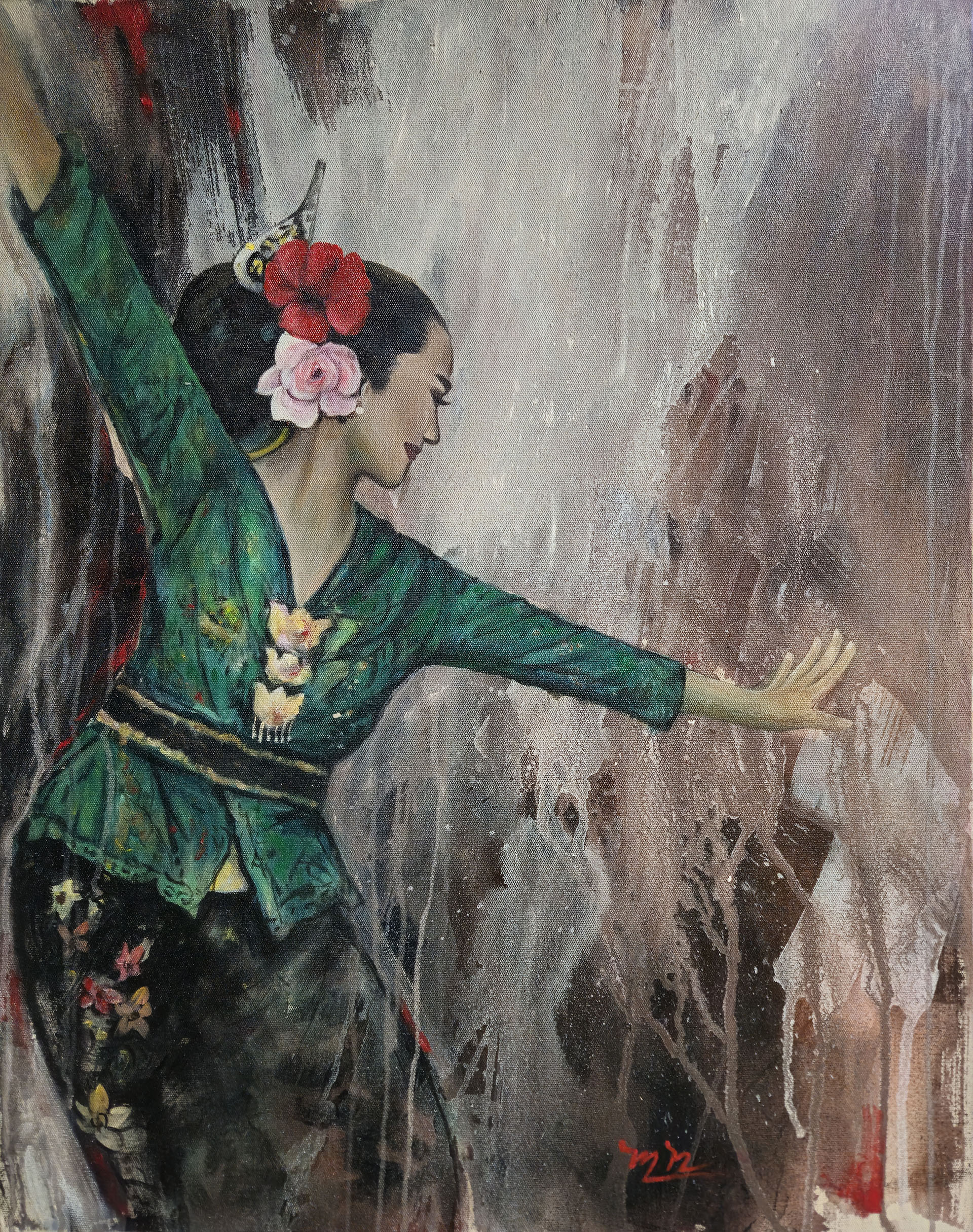Gerak gemulai namun energik dari seorang penari jaipong ini sangat indah. Kostum warna hijau tosca ditemani aksesoris yg menyertainya sangat cocok dengan warna grond yang diekspresikan kedalam sapuan tehnik aquarel. Menjadikan gaya lukisan ini sedikit beda.
