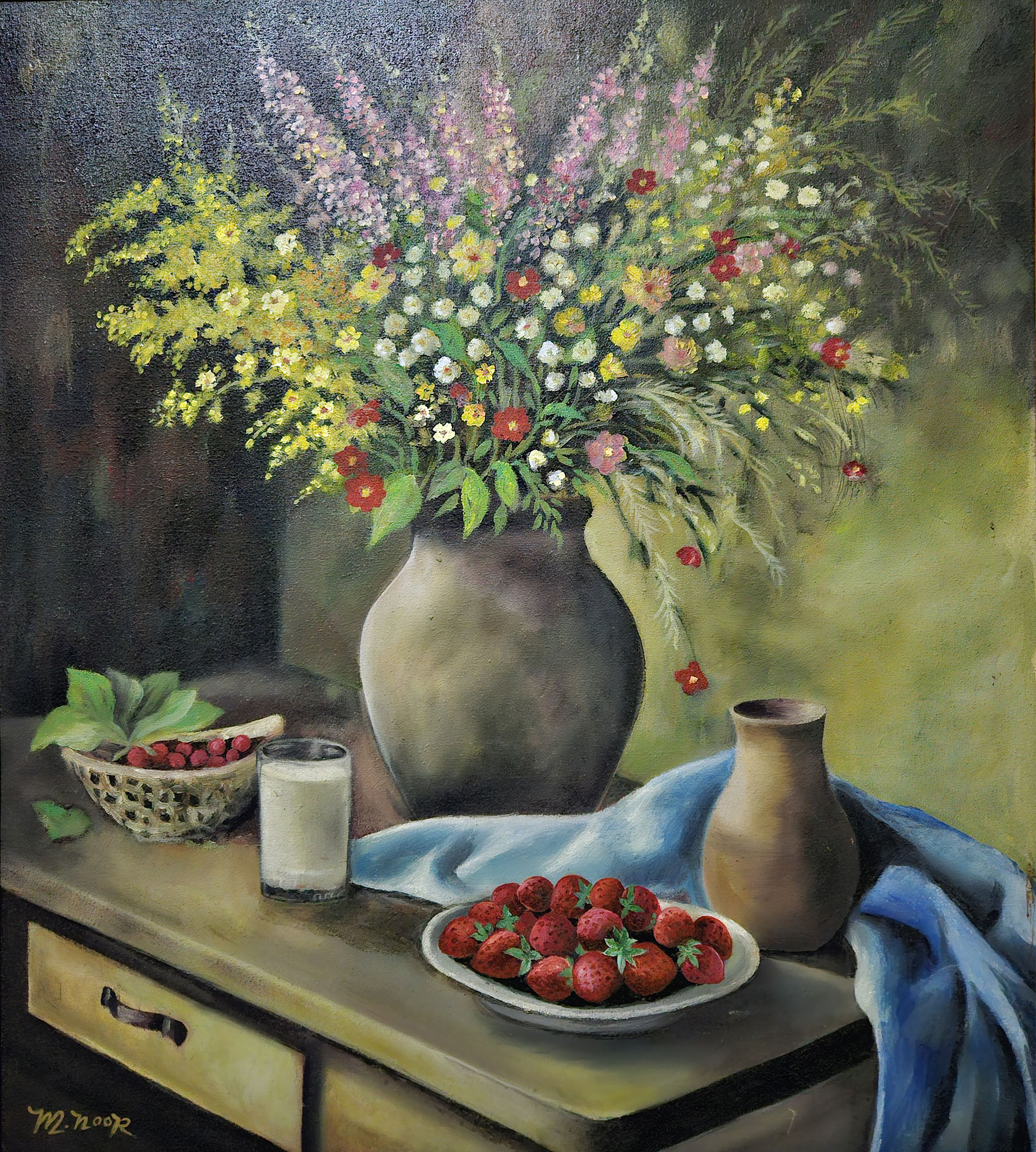 Lukisan life style dengan objek bunga dan disandingkan barang penghias lainnya seperti gelas, buah strawberry, meja yang membuat objek utama tampil lebih kuat dan komplit..