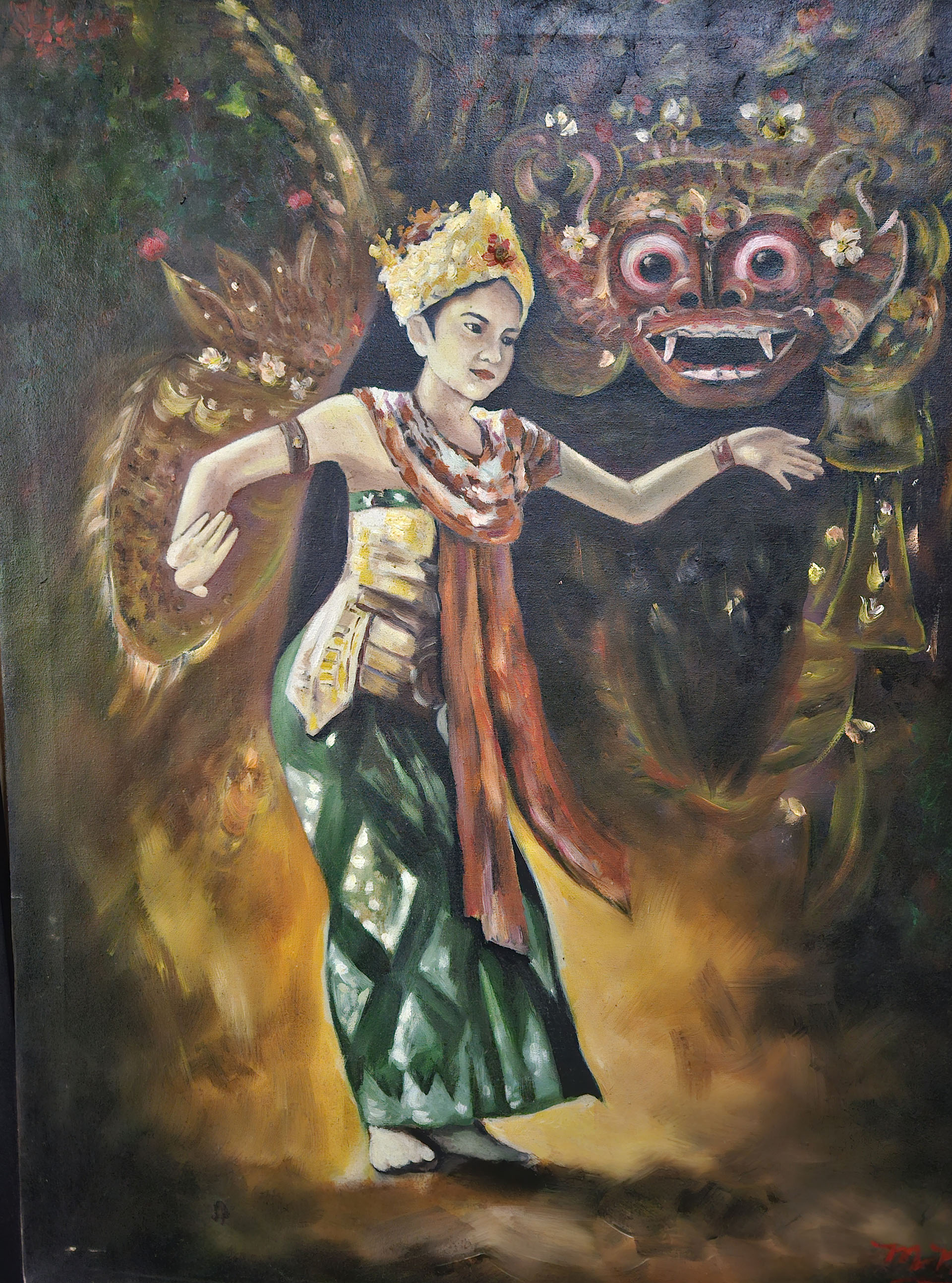 Gerak gemulai namun energik dari seorang penari jaipong ini sangat indah. Kostum warna hijau tosca ditemani aksesoris yg menyertainya sangat cocok dengan warna grond yang diekspresikan kedalam sapuan tehnik aquarel. Menjadikan gaya lukisan ini sedikit beda.