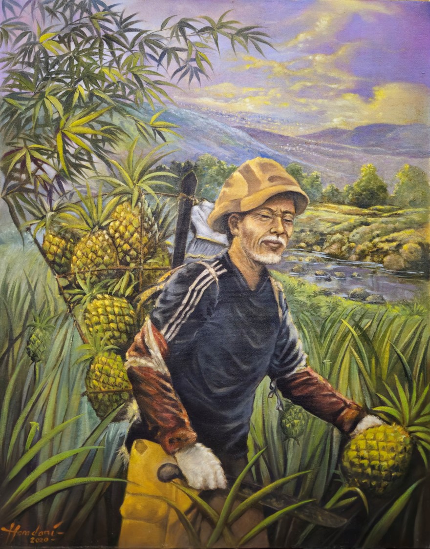 Dengan keidahan alamnya yg sejuk dan dingin, indah memesona, seorang kakek sedang panen nanas, dengan goloknya yg tajam