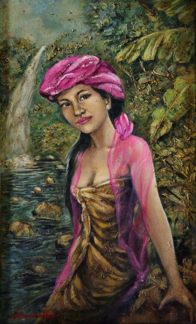 Sambil merenung pelukis membayangkan gadis manis, duduk-duduk santai usai mencuci, menikmati sejuknya udara sekitar sungai